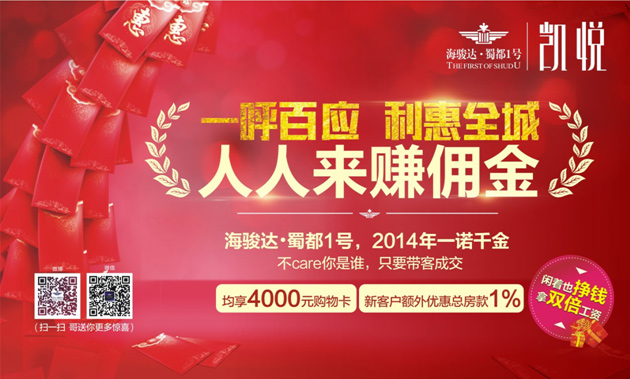 在今晨的“快閃”現場,一張紅色卡片在市民手中流傳,海駿達??蜀都1號“全民營銷”活動盛大開啟,為響應“一呼百應,利惠全城,人人來賺傭金”的口號,老業主或推薦人可享受4000元同等價值的恒創百貨購物卡,新客戶可以享受1%總房款購房優惠。海駿達?蜀都1號,2014年一諾千金!